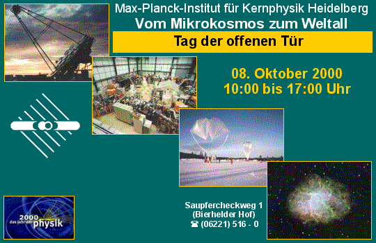 Im Jahr 2000, von Ministerin Edelgard Bulmahn zum Jahr der Physik ausgerufen, richtet sich das Augenmerk der wissenschafts-interessierten Öffentlichkeit in ganz besonderer Weise auf die physikalische Forschung. Am Sonntag, 8. Oktober, öffnete dann auch das Heidelberger Max-Planck-Institut am Bierhelder Hof zwischen 10 und 17 Uhr allen interessierten Laien und Fachleuten die Tore zum Tag der offenen Tür.